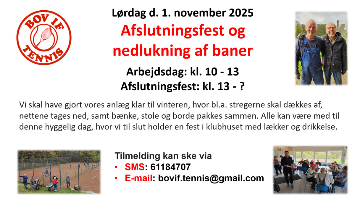 Bemærk, at I stadigvæk kan benytte alle banerne i hele oktober måned. Drop-in og seniortennis fortsætter som hidtil.